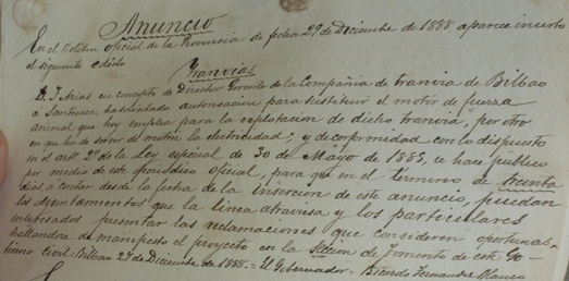 Solicitud de electrificación del tranvía de Bilbao a Santurtzi. Archivo Euskotren/Museo Vasco del Ferrocarril