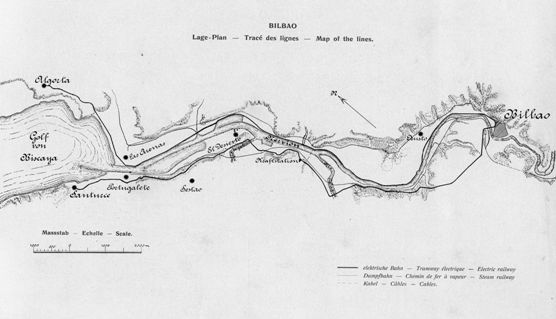Plano de las líneas de tranvías de Bilbao a Santurtzi y a Algorta, los primeros electrificados en el Estado. Archivo Euskotren/Museo Vasco del Ferrocarril