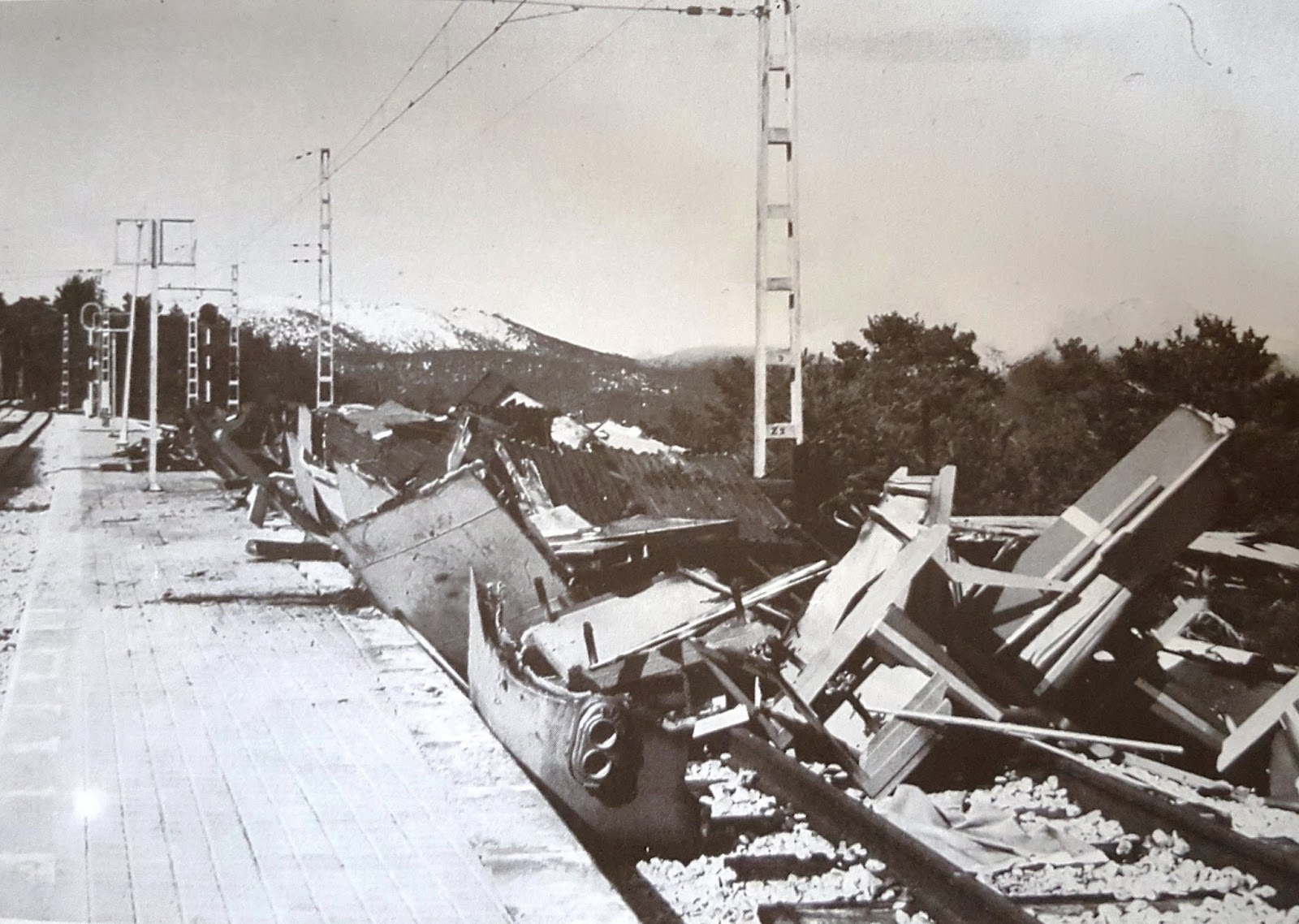| Finales de los 40 en la estación de Navacerrada. Se observa un deterioro mucho mayor en el coche motor que en el remolque. Parece que ello era debido a un uso mucho más intensivo de los coches motores, sobre todo en invierno. (Foto: autor desconocido) |