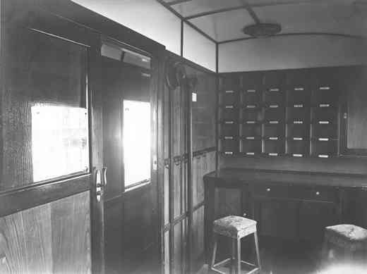 Interior del departamento de Correos del coche TCE-4 de los Ferrocarriles Vascongados. Archivo Euskotren/Museo Vasco del Ferrocarril