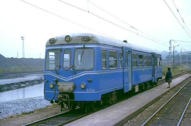 | El 2359, el primero vehículo del segundo pedido de FEVE fotografiado en Avilés en 1976 realizando un servicio en la línea de Carreño (foto: Werner Hardmeier) |