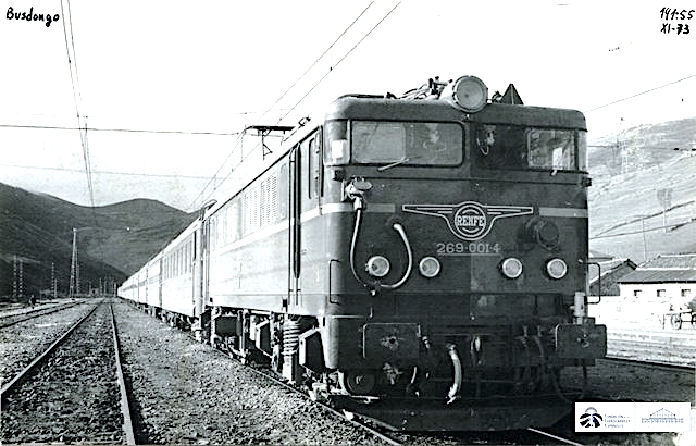 | En plena fase de pruebas, Justo Arenillas fotografió de nuevo a la 269-001 en la estación de Busdongo en cabeza de un largo convoy. Noviembre de 1973 (AHF/MFM) |