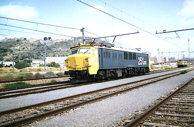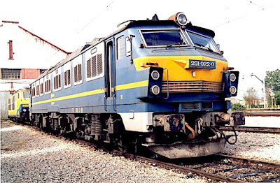 En la entrada dedicada a las "alemanas" de la serie 250, me referí al concurso convocado por RENFE a mediados de los 70 para la disposición de un conjunto de locomotoras de gran potencia, y comenté cómo fue resuelto mediante la compra de una serie de locomotoras alemanas -las 250- y otra de locomotoras japonesas, la 251. La solución alemana basada en bogies monomotores y birreductores de tres ejes era muy compleja y tuvo problemas ya desde su puesta a punto. Sin embargo, la japonesa basada en la amplia experiencia de bogies de dos ejes utilizados en todas las series 279, 289 y 269 y con equipos electrónicos de potencia, destacó claramente desde el principio por su eficacia y rendimiento. Además, la posible dificultad que podía provenir de un rodaje de tres bogies fue perfectamente solventada gracias a un buen diseño funcional del bogie central. De algún modo se puede considerar que las 251 fueron una evolución lógica de las 269 hacia mayores pesos y potencias llegándose incluso a decir que una 251 era una "269 y media". En concreto, su gran peso de 138 toneladas le brindaba una cierta ventaja a las 250 en adherencia y esfuerzo de tracción, si bien, a velocidad máxima, el esfuerzo de tracción de las 250 era mayor. Quizás todo ello llevó a que, si bien en principio, se había pensado en asignar la serie 250 a la línea Gijón-León, fuera al final la 251 la elegida.
