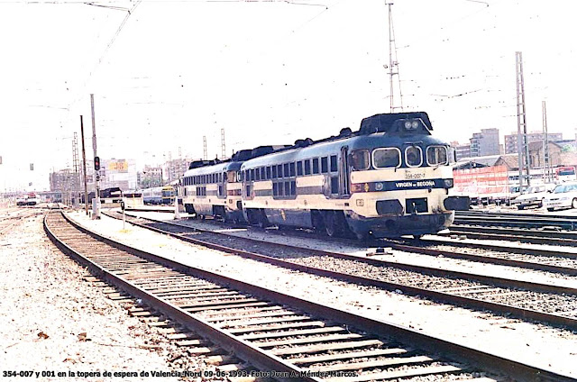 | Otra imagen del mismo tren encabezado en este caso por la 354-007. Julio de 1993 (foto: J. A. Méndez Marcos) |