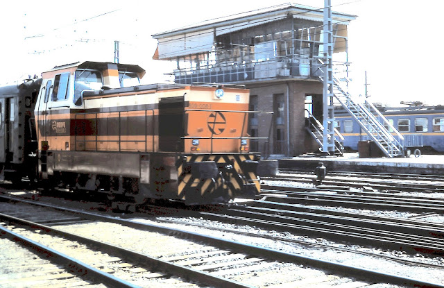| La 309-008 en Atocha con su inconfundible caseta de enclavamientos en segundo plano. Al fondo, una 440 en colores originales. Marzo del 87 (Foto: Ángel Rivera) |