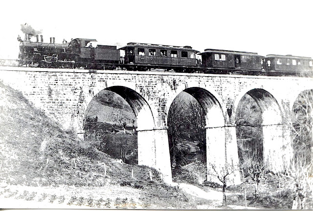 | Tren de viajeros sobre un viaducto cercano a Lasarte (foto: Euskotren/Museo Vasco del Ferrocarril) |