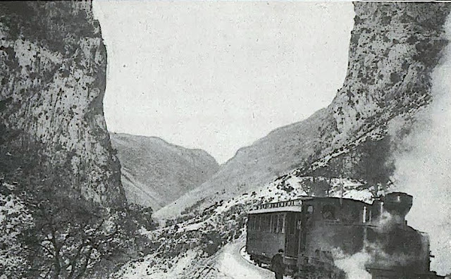 | Bajo la Peña de Dos Hermanas está detenido un pequeño convoy formado por la 020T (probablemente) con un coche de viajeros (foto: autor desconocido) |