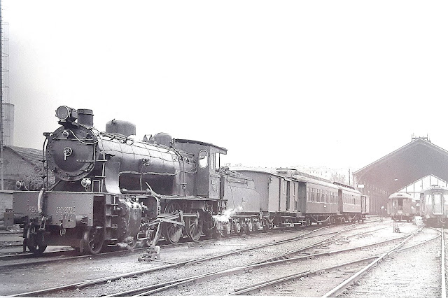 | En esta magnífica fotografía de Harald Navé tomada en el verano de 1962, una Linke encabeza un tren de viajeros abandonando la estación de Toledo hacia Madrid, seguramente vía Villaseca y Parla. Me resulta llamativo el gran número de coches que arrastraba ya que solía encabezar composiciones con dos o tres coches de caja de madera; quizás podría tratarse de alguna composición especial o de coches metálicos añadidos por algún motivo. Tras este tren aparecen algunos coches de viajeros que debían pertenecer al ómnibus Toledo-Aranjuez-Madrid ("El Turista") que salía cerca de las siete de la tarde encabezado presumiblemente por la Mikado que asoma por el borde derecho de la imagen situada sobre la placa giratoria y que le habría traído por la mañana desde Madrid. |