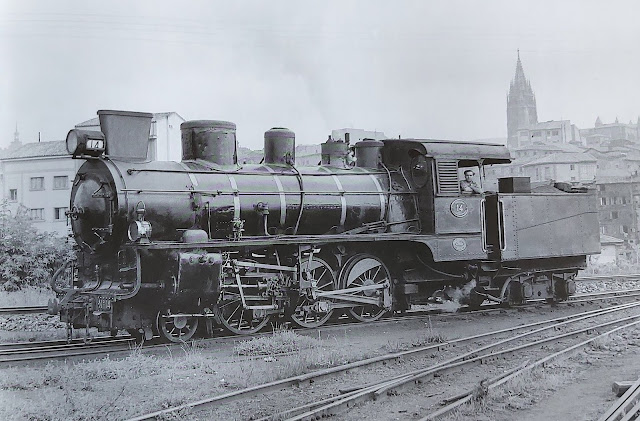 | La 18 en cabeza de su tren en Figaredo. Iba ahora ya dotada del eyector Giesl (autor desconocido/cortesía Eduardo J. Fernández Martinez) |