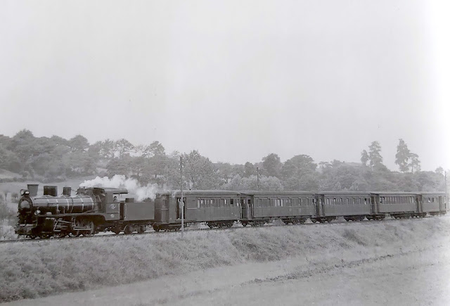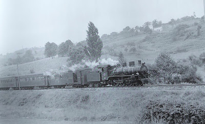 | La V.A. Nº 2 "Oviedo" sale justamente de Oviedo en cabeza de un tren hacia San Esteban de Pravia en mayo de 1962 (L.G. Marshall) |