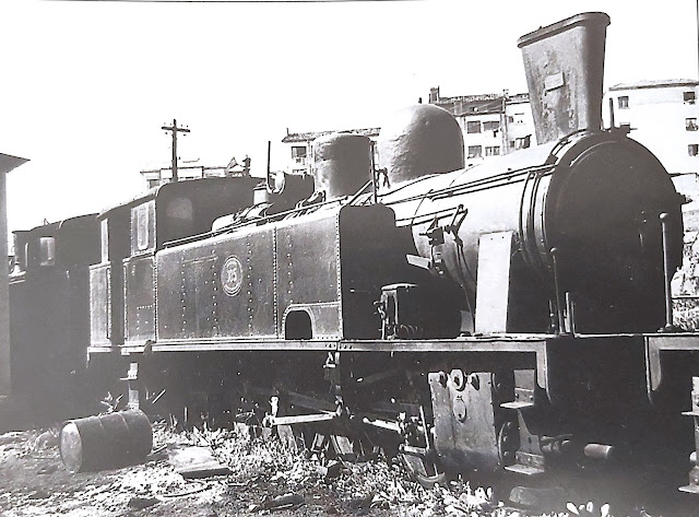 La Babcock&Wilcox nº 8 del Vasco Asturiano, última vaporosa construida en España para vía estrecha, en los talleres de FEVE en El Berrón (autor desconocido)