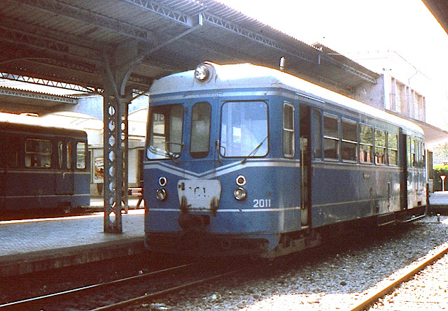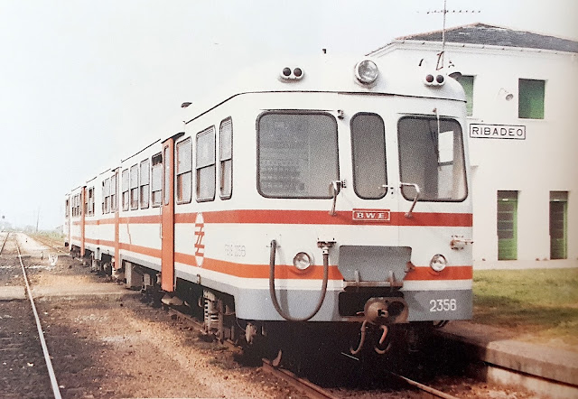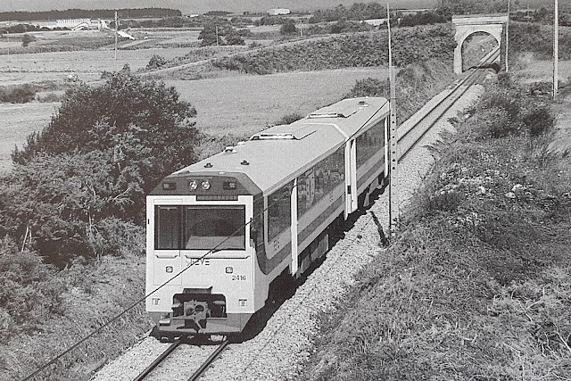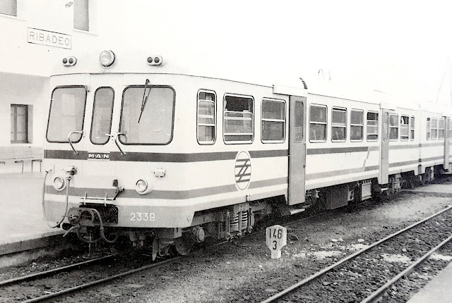 Tras haber visitado los ferrocarriles asturianos de vía estrecha con servicio de viajeros, seguimos nuestro recorrido cantábrico hacia el oeste por el largo camino ferroviario de Gijón a El Ferrol. Y cuando digo "largo" no me refiero sólo a los algo más de 300 km de vía entre ambas ciudades sino también por su larguísimo periodo de gestación y ejecución que se extendió desde los primeros años del siglo XX -aunque ya se trabajaba en ello en los últimos del XIX- hasta la inauguración completa de la línea en 1972. Tuvo mucho que ver en ello la gran cantidad de peripecias políticas que dificultaron su avance, aunque también es verdad que fueron otros condicionantes políticos los que forzaron su finalización e inauguración en una época en que, de no ser por ellos, posiblemente hubiera quedado inconclusa. Hoy la línea sigue en funcionamiento pero sin ofrecer en absoluto el servicio que demanda la sociedad actual y en una situación muy incierta entre la posibilidad de un cierre o de otra, quizás menos probable y desde luego más lejana, de transformarse en parte de una moderna vía ferroviaria que recorriera toda la cornisa cantábrica. De momento recordemos someramente su historia y a los vehículos que circularon y todavía circulan por ella.
