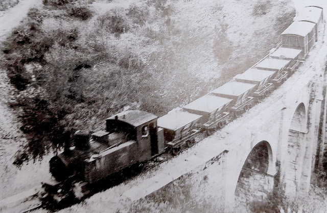 | Un tren mixto encabezado por la nº 2 "Villaodrid" saliendo de Ribadeo y pasando sobre el viaducto de Rego da Viña (colección Miquel Palou) |