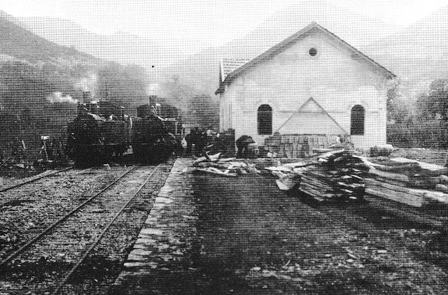 | Dos de las locomotoras del Villaodrid a Ribadeo fotografiadas en la estación de Palacios de Sil durante las obras de construcción del Ferrocarril de Ponferrada a Villablino (autor desconocido) |