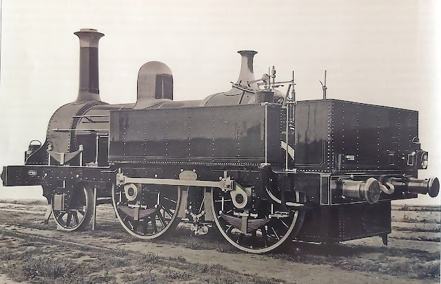 | Configuración de estas locomotoras en 1884, ya en el TBF. Disponen ya de tender y de una rudimentaria protección para el personal (Archivo CEHFE) |