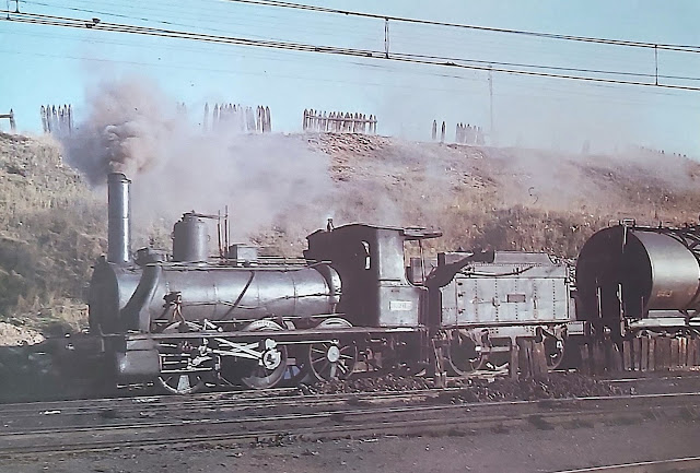 | En marzo de 1958 Karl Wyrsch fotografió en la zona de Santa Catalina, cercana al depósito madrileño de Cerro Negro esta larga fila de locomotoras que esperaban el desguace. En primer término aparece una de las locomotoras de esta serie (AHF/MFM) |