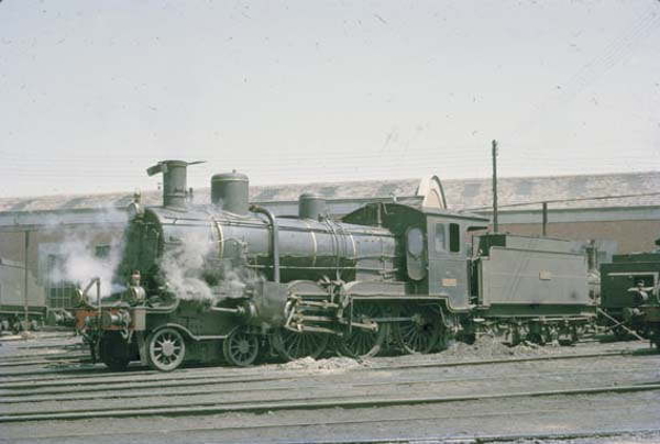 | En Zaragoza, en 1965, todavía trabajaba, ya muy deteriorada, una de nuestras locomotoras (J. B. Snell) |