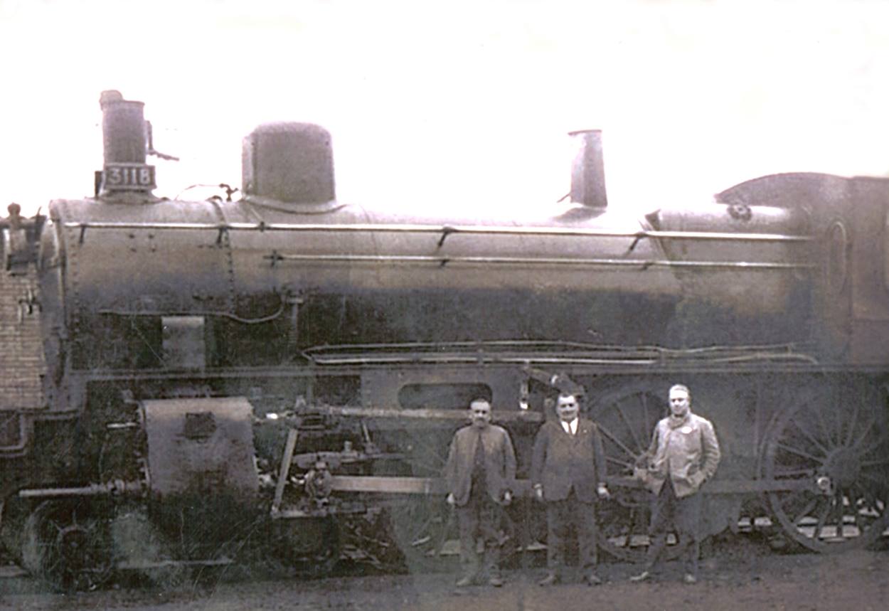 | La 3118 en el depósito de Monforte en los años treinta. El jefe del depósito se fotografía con la pareja de conducción (autor desconocido/cortesía J, A. Méndez Marcos) |