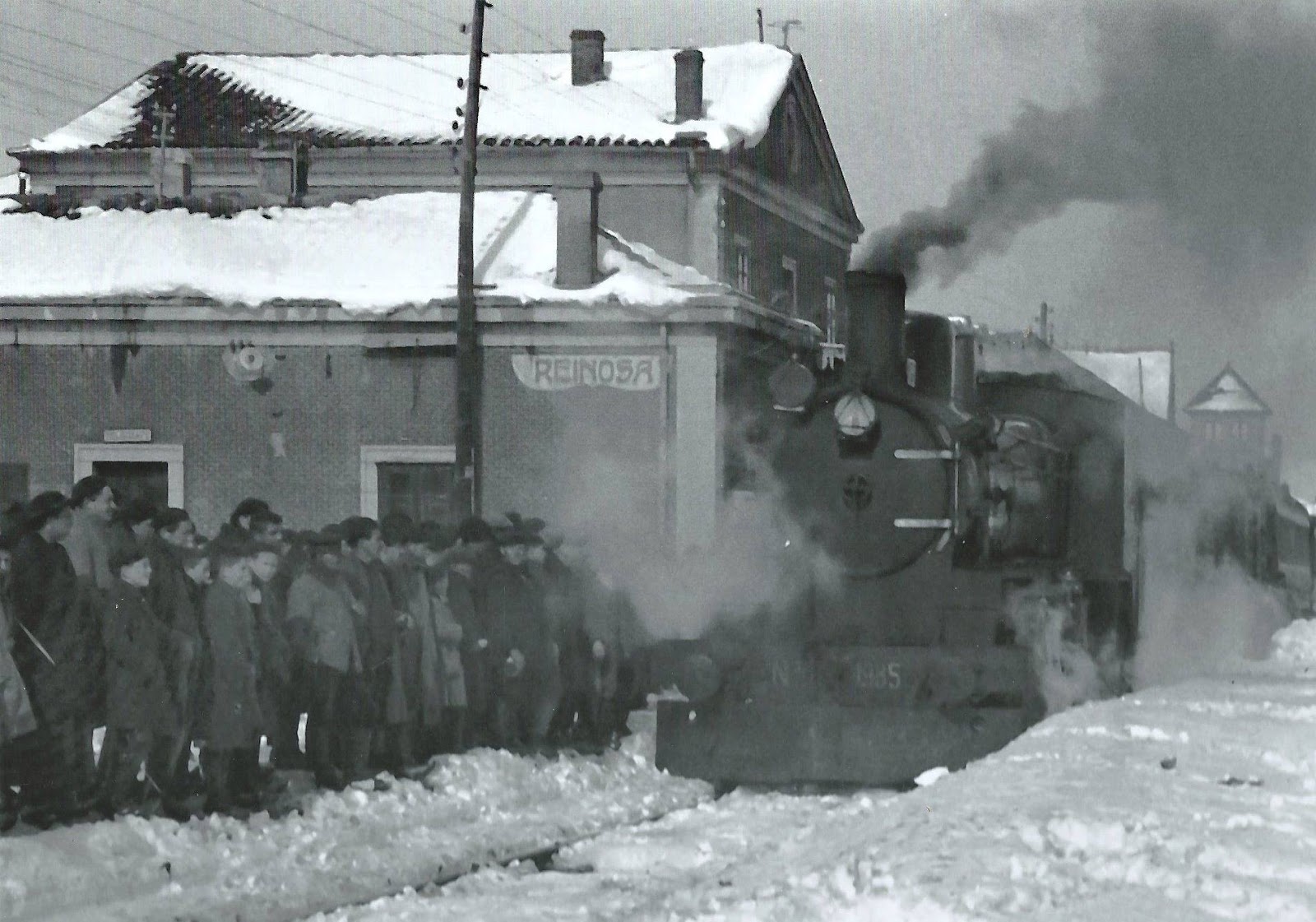 | Y aquí la misma locomotora en un ambiente plenamente invernal en la estación de Reinosa (autor desconocido/cortesía J. A. Méndez Marcos) |