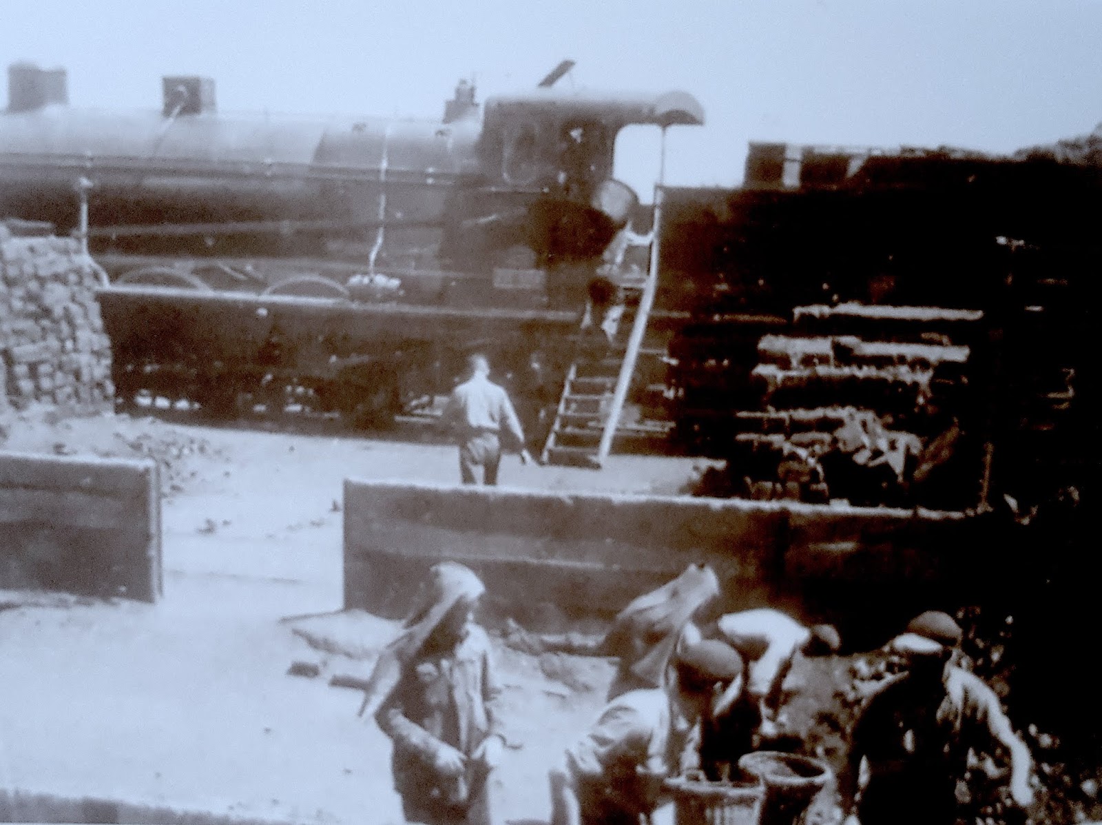 Venta de Baños, primeros años cuarenta. La 3014 con su maquinista apoyado sobre ella y a la izquierda el jefe de noche. Tras la locomotora aparecen un gran número de briquetas para ser cargadas en las locomotoras (autor desconocido/cortesía J. A. Méndez Marcos)