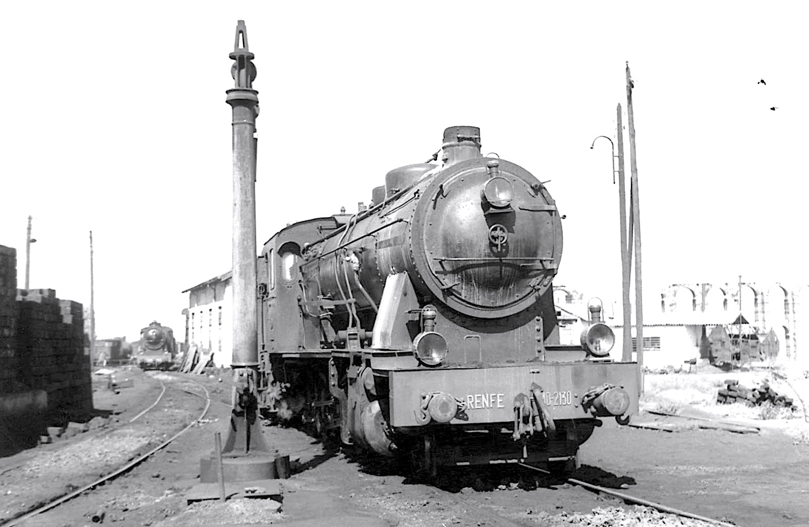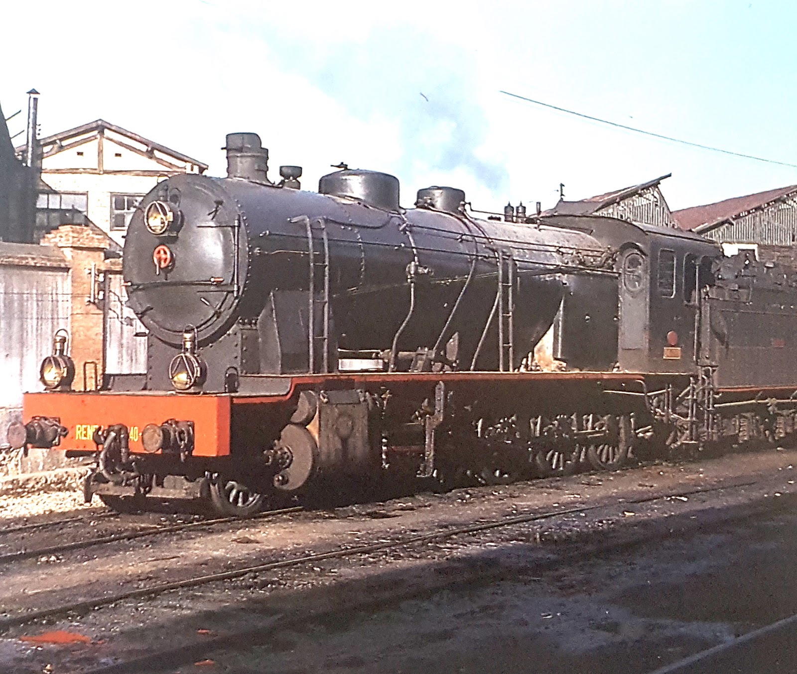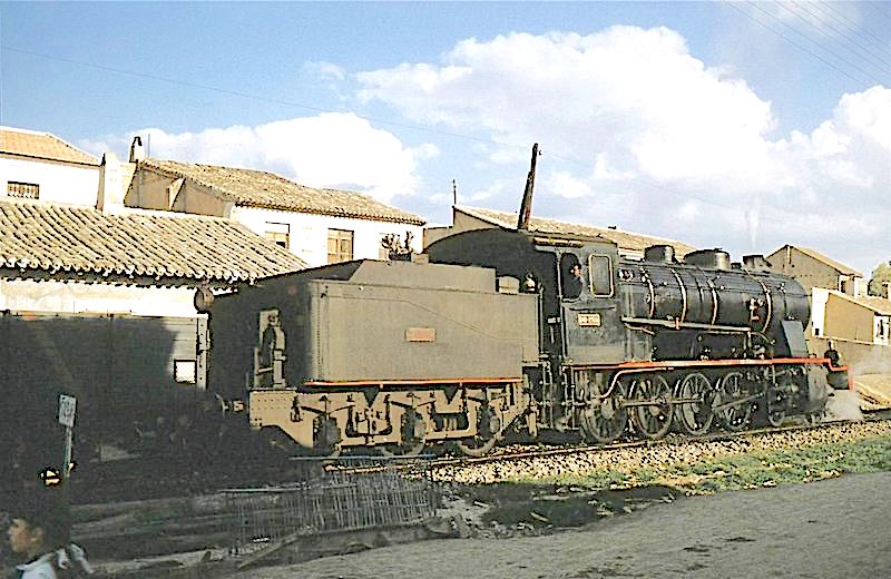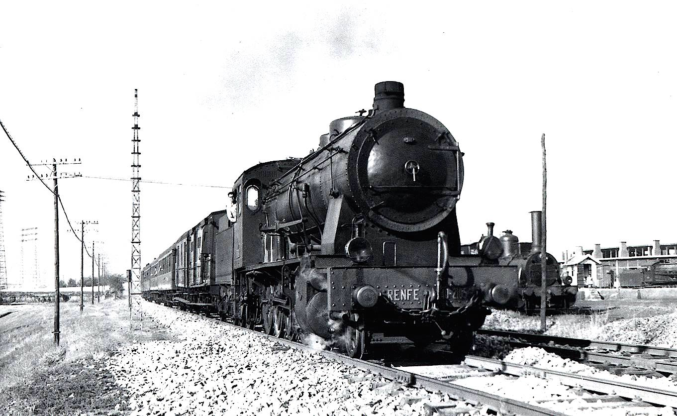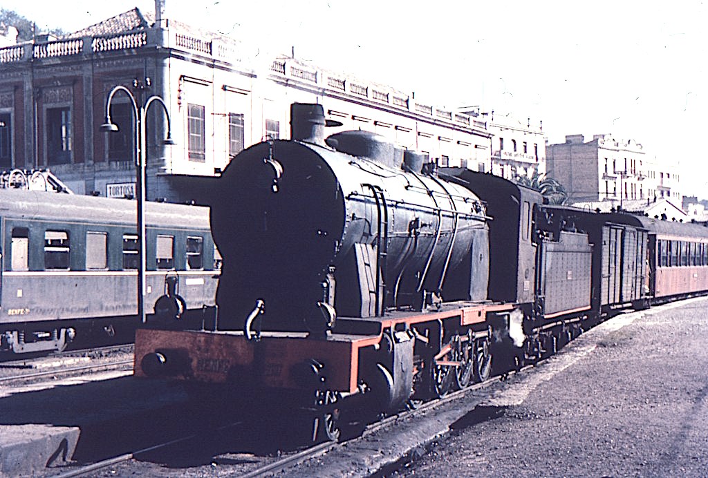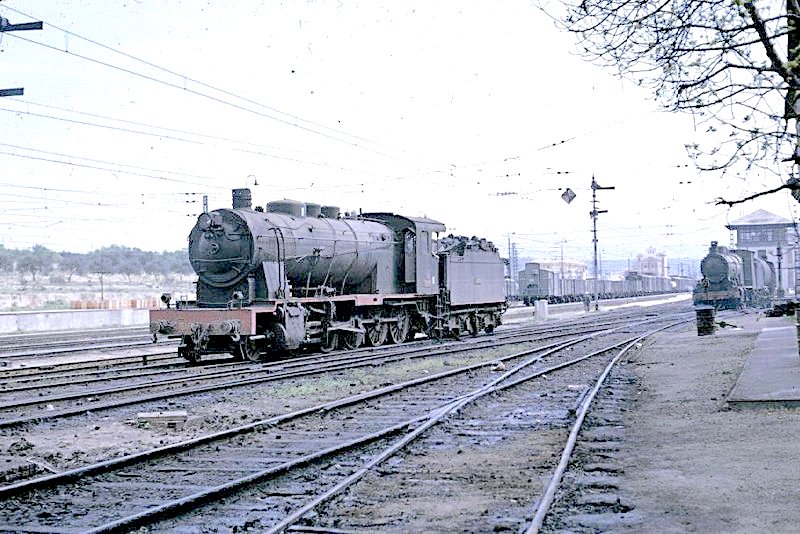 | Una locomotora de la serie en el depósito de Tortosa. Años sesenta (autor desconocido/a través de J. A. Pacheco/Forotrenes) |