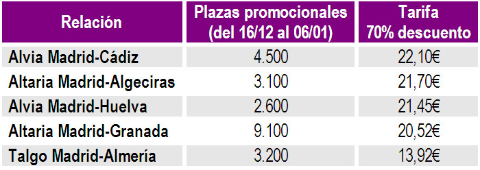 (12/12/2013) Renfe ha puesto a la venta 147.000 plazas promocionales para viajar entre Andalucía y Madrid durante Navidad, desde el día 16 de diciembre hasta el próximo 6 de enero. Estas plazas se comercializan con descuentos de hasta el 70 por ciento y se encuentran ya a la venta a través de la web de Renfe.